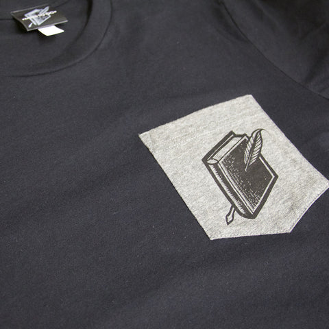 The MTG book logo has been printed with waterbase ink onto a black pocket tee with a contrasting heather grey pocket.
