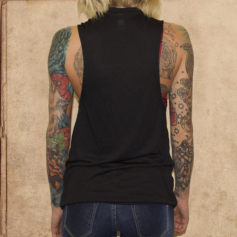 Inspired by the Black Cat by Poe and printed using discharge ink onto a tri-blend relaxed fit women's sleeveless tank. Incredibly soft.